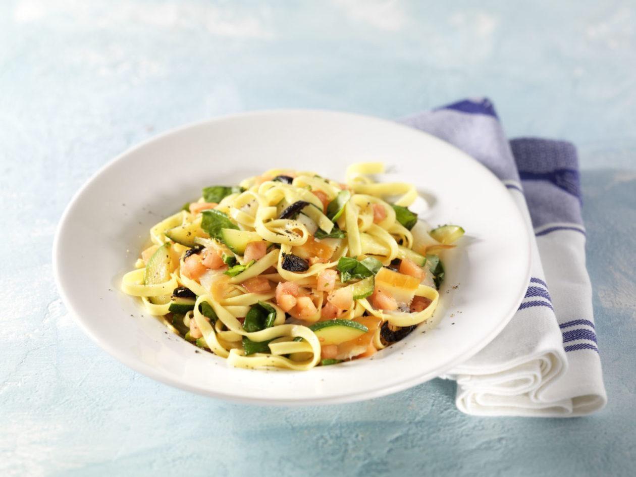 - Währenddessen die Zucchetti putzen, halbieren und in dünne Scheiben schneiden. Die Tomaten fein würfeln. Die Basilikumblättchen in grobe Stücke zupfen. Den Knoblauch schälen und in dünne Scheiben schneiden. Den geräucherten Seelachs in Stücke schneiden. Die Oliven nach Wunsch in Scheiben schneiden.