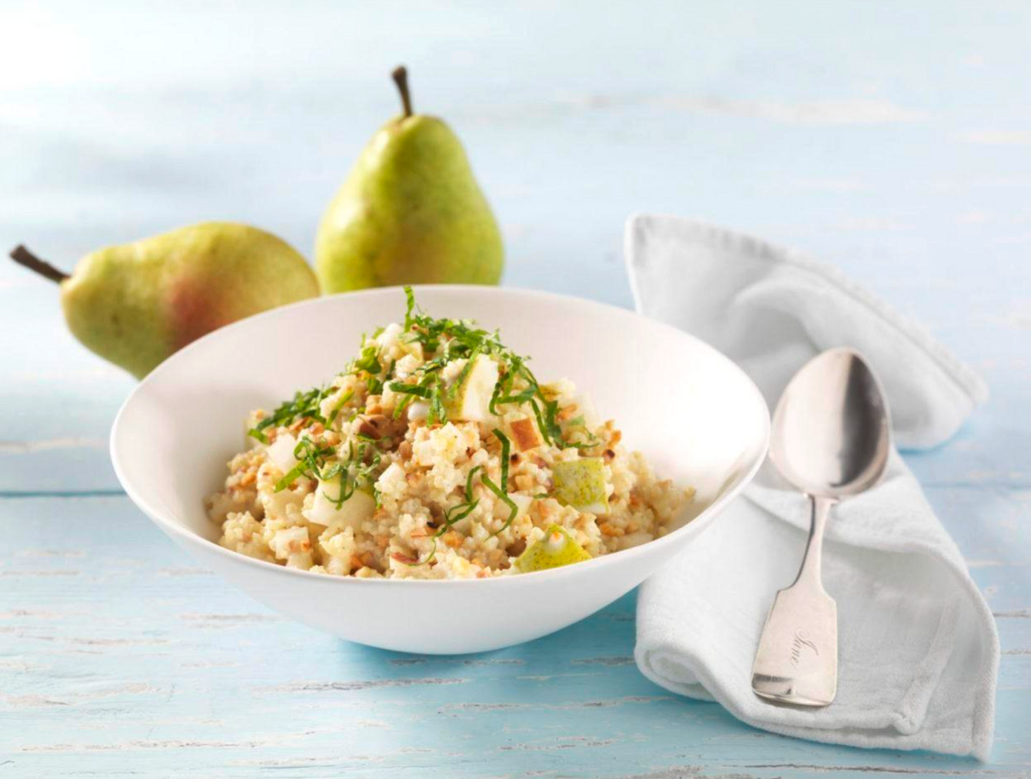 - Mélanger le millet, les poires et le mélange lait caillé-fromage blanc, puis répartir dans des coupelles. Saupoudrer de menthe.