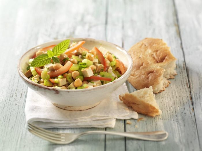 - Mélanger tous les ingrédients. Incorporer délicatement le tofu. Servir avec le pain plat.