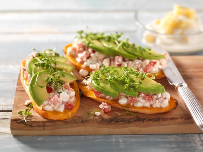 - Dénoyauter l'avocat, prélever la chair avec une cuillère, la couper en tranches et arroser de jus de citron. Sortir les toasts de patate douce du four, étaler le fromage blanc dessus, puis disposer les tranches d'avocat. Couper la cressonnette du jardin et en parsemer.