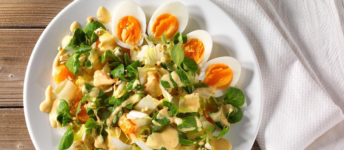 - Mescolare radicchio, valerianella e pezzi di mandarino e distribuirli in due ciotole. Sbucciare le uova, tagliarle a metà e disporle sopra. Versare il condimento al mandarino e curry e cospargere con le noci di anacardio. Servire con pane integrale.