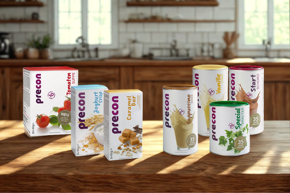 Unsere Pakete enthalten verschiedene Precon Produkte (z. B. Shakes, Müesli, Riegel oder Suppen). Alle Produkte sind nach den gleichen hohen Qualitätsstandards hergestellt und als vollwertige Mahlzeiten im Rahmen der Precon Ernährung geeignet.