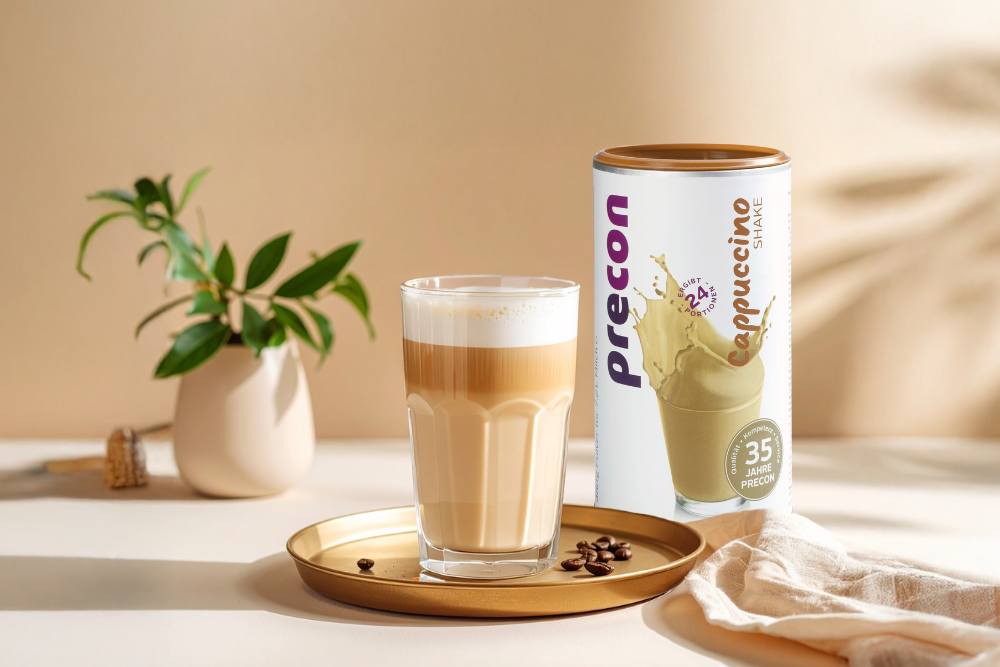 Ob klassisch oder kreativ verfeinert: Der Precon Cappuccino Shake lässt sich auf verschiedene Arten geniessen.
