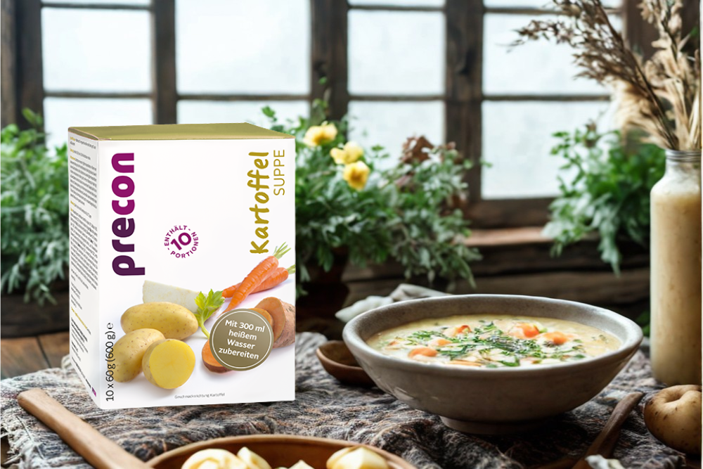 Kollagenhydrolysat*, Kartoffelflocken (Kartoffeln, Emulgator (E471), Kurkuma) (15.0 %), Maltodextrin, Maisstärke, Emulgator (Lecithine (enthält Soja)), gekörnte Brühe (Würze (enthält Soja), Salz, pflanzliches Fett (Palmöl)), Süsskartoffelpulver (5.0 %), Karottenpulver (2.0 %), Zwiebeln, Aroma (enthält Sellerie), Curry, Verdickungsmittel (Xanthan), Lauch, Blumenkohlpulver (Blumenkohl, Glukosesirup, Maisstärke, Emulgator (Lecithine)), L-Methionin, L-Histidin, Petersilie, Sellerieknollenpulver (0.3 %), Trennmittel (Siliciumdioxid), schwarzer Pfeffer, L-Tryptophan, Muskat, Kurkuma-Extrakt, Süssungsmittel (Sucralose), Antioxidationsmittel (Alpha-Tocopherol), Vitamine (A, B1, B2, B6, B12, C, D, E, K, Niacin, Pantothensäure, Folsäure, Biotin), Mineralstoffe (Dikaliumphosphat, Speisesalz, Tri-Calciumphosphat, Magnesiumhydroxid, Eisen(II)-sulfat, Zinkoxid, Kupfer(II)-gluconat, Mangan(II)-sulfat, Kaliumjodid, Natriumselenit, Natriummolybdat).
