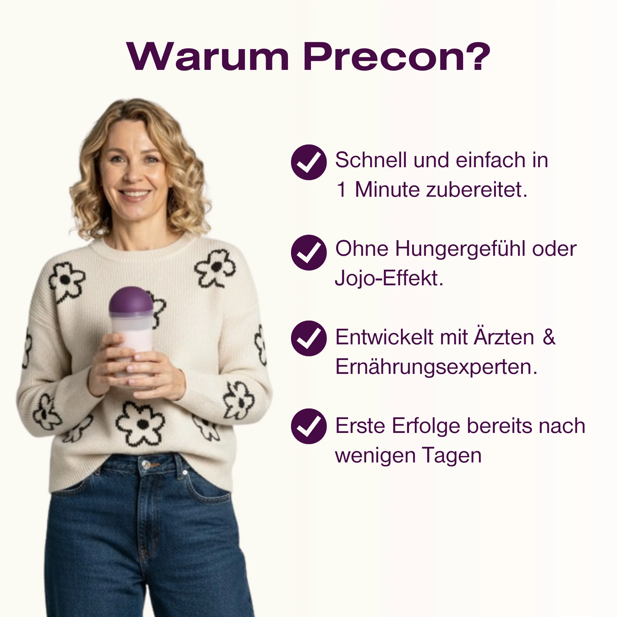 Precon ist die erste Diät die schmeckt und man kostenlos begleitet wird mit vielen schönen Diät Rezepten einfach und schnell ich hoffe das ich durch halte und mein Wunschgewicht endlich erreichen werde.